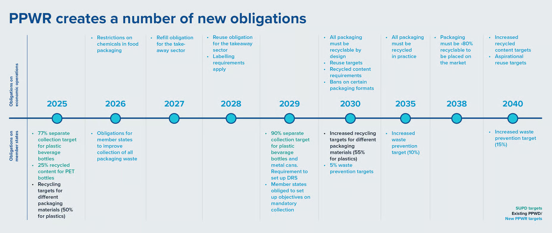 值(zhi)得注(zhu)意(yi)的是,PPWR 并未取代 SUPD。《一次性塑料指令(ling)》仍作(zuo)為“特別法”存在(zai),即一項在(zai)其范(fan)圍內優先(xian)于一般規(gui)定的具體法律。同時,PPWR 納(na)入了 SUPD 對塑料飲料瓶再生料含量的目標及相(xiang)關報告義(yi)務。